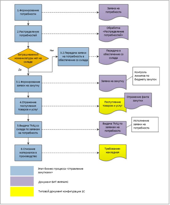Подсистема «Управление закупками» предоставляет возможности для оперативного планирования закупок на основании потребностей центров финансовой ответственности компании в материально-технических ресурсах, оборудовании и услугах. Схема бизнес-процесса управления закупками в системе «БИТ.ФИНАНС» выглядит следующим образом: