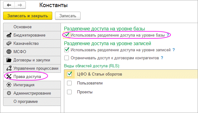 Для включения механизма настройки прав доступа на уровне базы необходимо установить флаг «Использовать разделение доступа на уровне базы» в константах на закладке «Права доступа» (раздел «Настройки (БИТ)» - команда панели действий «Константы (БИТ)»).