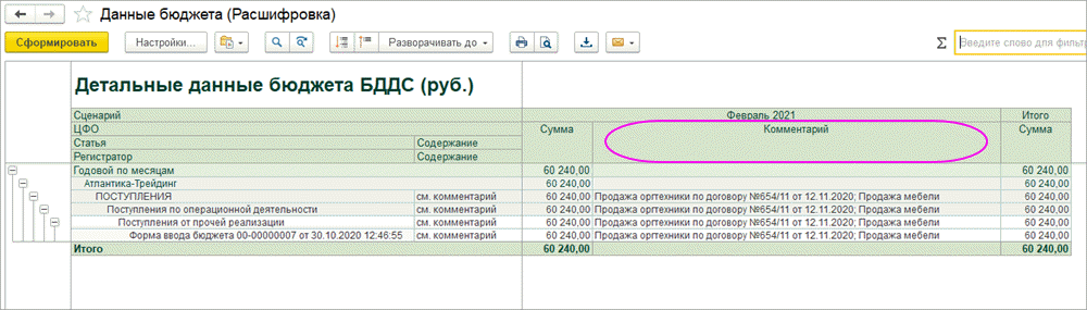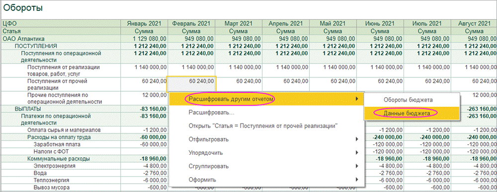 Отчет может быть расшифрован (двойной щелчок мыши на ячейке) отчетами «Обороты бюджета» и «Данные бюджета» (отчет с комментариями к строкам бюджета).