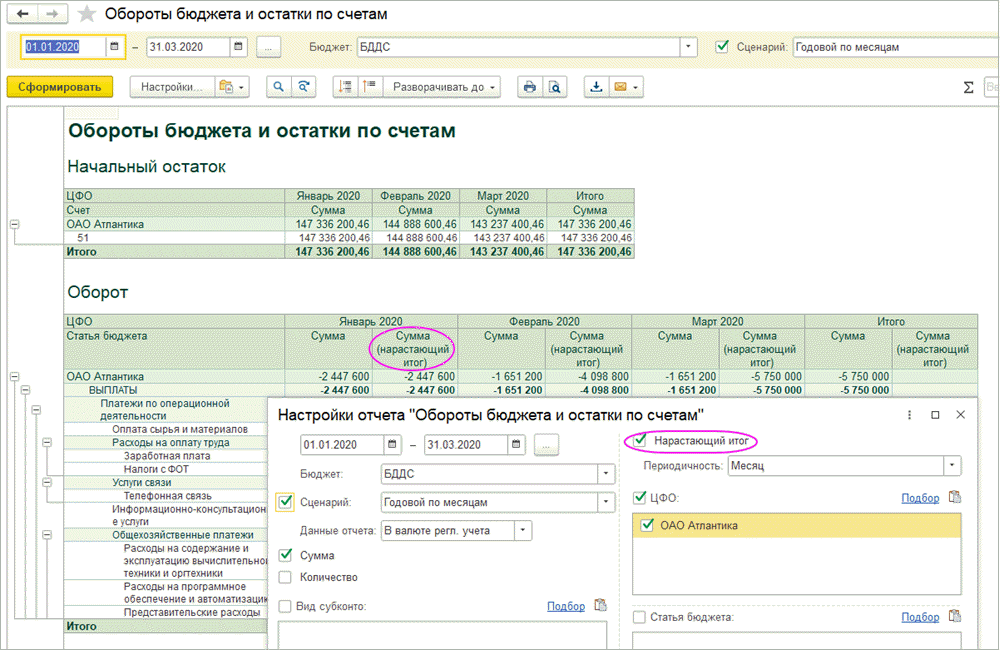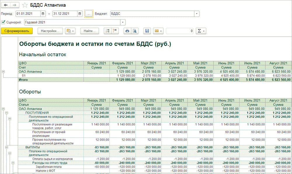 Отчет помимо оборотов по статьям показывает также начальные и конечные остатки по счетам бюджетирования, заданным для выбранного бюджета в справочнике «Бюджеты».