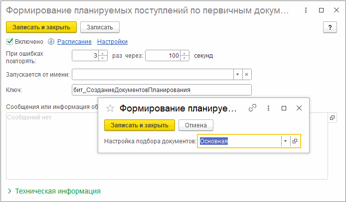 В системе реализовано регламентное задание “Формирование заявок на расходование ДС по первичным документам”. В настройках регламентного задания указывается настройка одноименной обработки, в которой можно установить отбор по типам документам, на основании которых требуется создавать заявки, другие отборы, период и режим записи создаваемых документов.