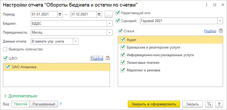 Отчеты формируются в одной их 4 валют: валюта регламентированного учета, валюта управленческого учета, валюта сценария или валюта документа. Выбор валюты отчета осуществляется в Настройках отчета. Так же в настройках указывается периодичность вывода данных, вывод сумм нарастающим итогом в отдельной колонке, вывод количества, устанавливается быстрый отбор по ЦФО и статья оборотов/статьям бюджета. Для более сложных настроек нужно перейти к виду «Расширенный».