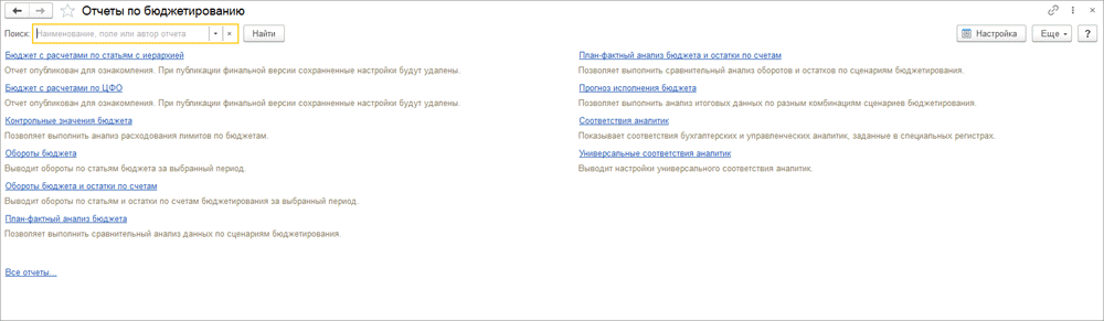 Пакет отчетов по бюджетированию разработан с использованием «1С:Библиотеки стандартных подсистем». Отчеты размещены в разделе «Бюджетирование» по ссылке «Отчеты по бюджетированию» (левый верхний угол страницы).