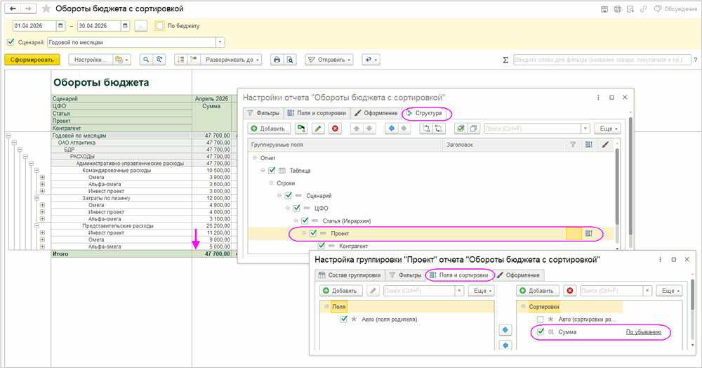 В отчетах "Обороты бюджета", "Обороты бюджета с остатками" и "Обороты бюджета с расчетами" возможна сортировка по сумме. Настроить сортировку можно на уровне нужной группировки, к примеру, на уровне группировки "Проект". В отчетах "План-фактный анализ бюджета" сортировку по сумме выполнить нельзя из-за технических особенностей отчета.