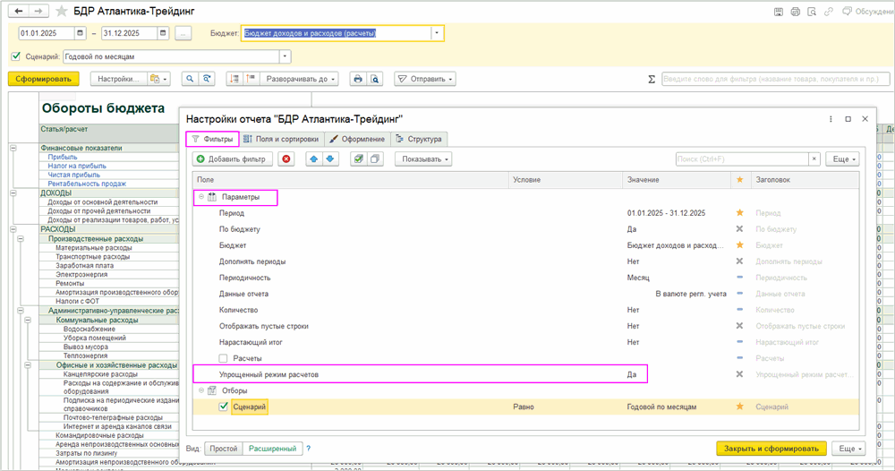 Важно!!! Отчеты с большим количеством сложных расчетов могут формироваться длительное время. В релизе 3.1.66 в отчеты с расчетами (Настройки - Фильтры - Параметры) добавлен параметр «Упрощенный режим расчетов». При выборе значения «Да» для данного режима увеличится скорость формирования отчета, но вычисление расчетных показателей будет выполняться с ограничениями: