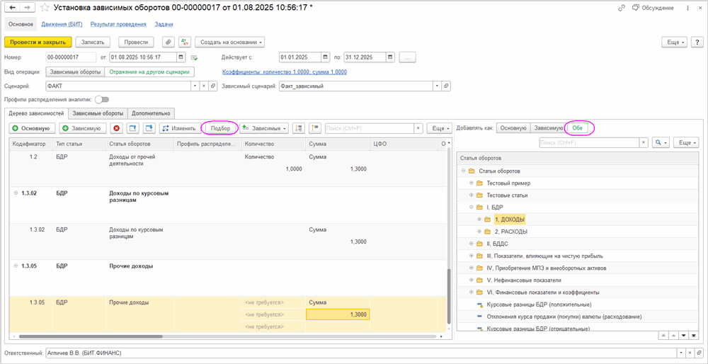 Начиная с релизов 3.1.64 (1С:БП и 1С:БП КОРП) и 3.2.44 (1С:ERP и 1С:КА) в системе реализован механизм формирования зависимых оборотов на другой сценарий в автоматическом режиме при проведении типовых документов 1С и документов бюджетирования БИТ.ФИНАНС.