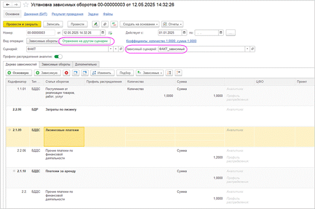 Настройка зависимостей статей выполняется в документе “Установка зависимых оборотов” с видом операции “Отражение на другом сценарии”.