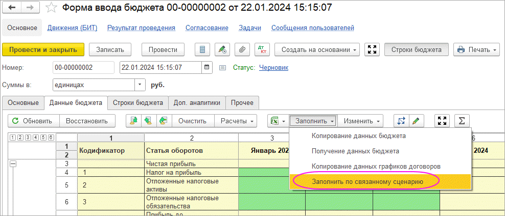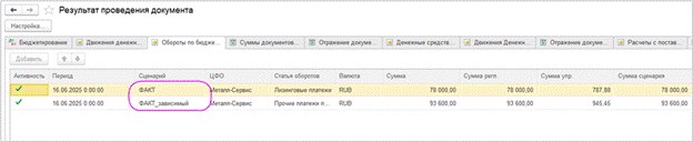 Примечание. Ранее для формирования зависимых оборотов на другой сценарий нужно было использовать специальную обработку "Получение данных из связанного сценария" в документах "Форма ввода бюджета" и "Бюджетная операция".