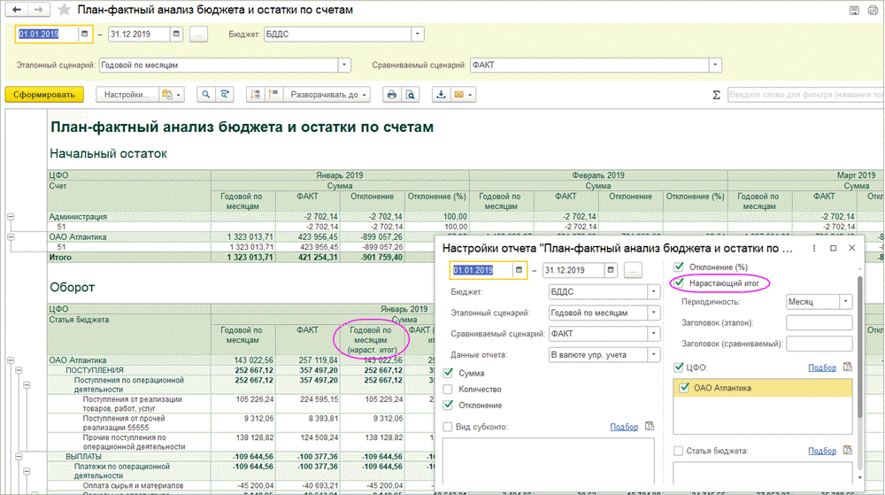 Отчет показывает плановые и фактические обороты по статьям бюджетов за выбранный период, а также начальные и конечные остатки по счетам плана счетов бюджетирования.