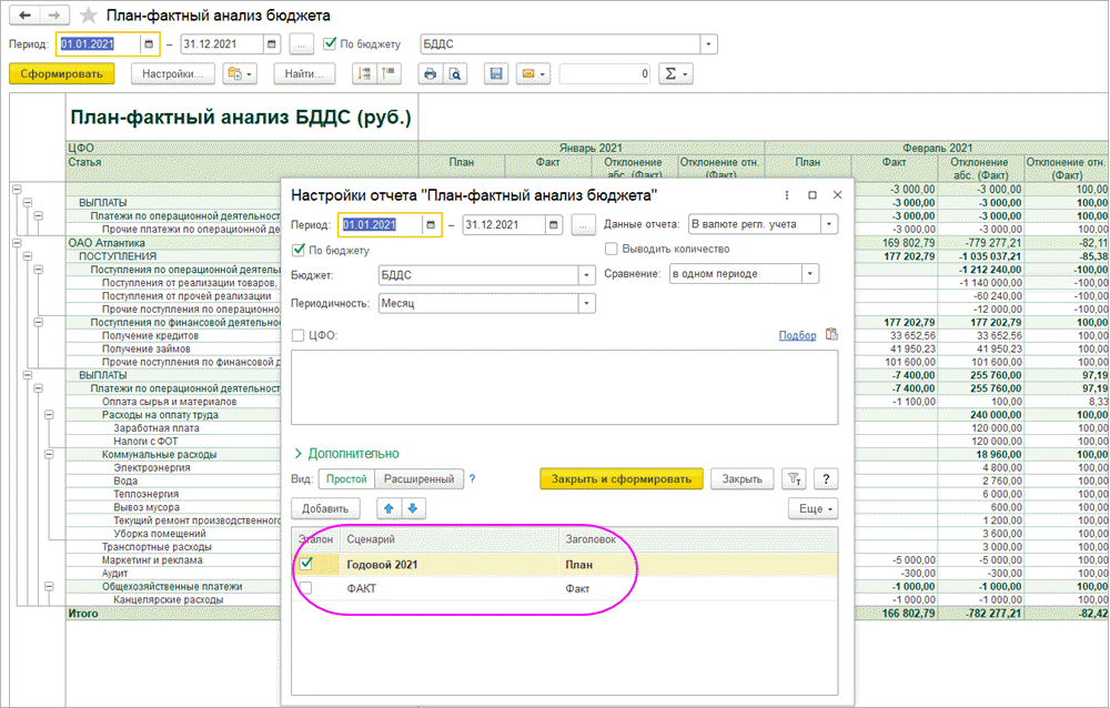 Отчет может сравнивать данные по сценариям как за один период (период отчета), так и за аналогичные периоды разных лет, к примеру, можно сравнить данные за 2020 и за 2021 год: при периодичности Месяц между собой будут сравниваться данные за Январь 2020 и Январь 2021, Февраль 2020 и Февраль 2021 и т.д.