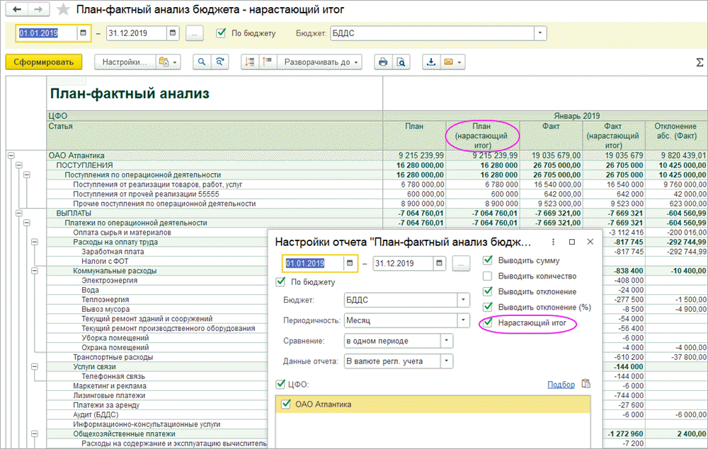 В отчете можно настроить вывод нарастающего итога. Для этого необходимо в настройках установить флаг Нарастающий итог.