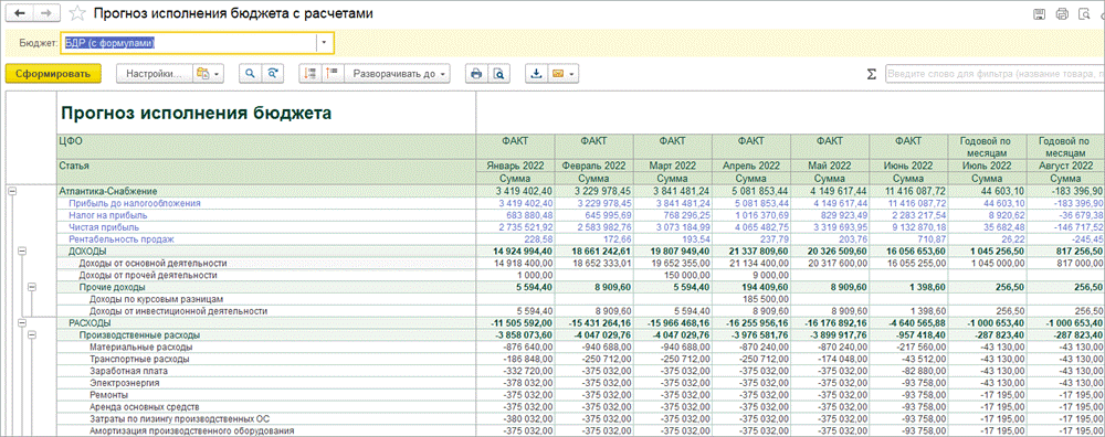 В настройках отчета можно указать несколько сценариев и временной интервал, за который необходимо вывести данные по этим сценариям. В итоге получим сумму показателей по комбинации сценариев бюджетирования. Например, можно указать для определенного периода времени (например, 9 месяцев текущего года) фактический сценарий, а для следующего периода времени (например, 4 квартал текущего года) – плановый сценарий. Таким образом, получим отчет по ожидаемому исполнению бюджета за текущий год.