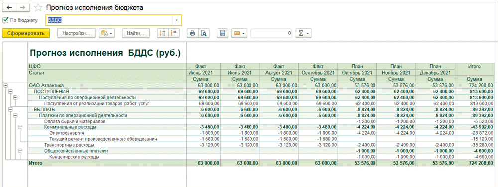 В настройках отчета можно указать несколько сценариев и временной интервал, за который необходимо вывести данные по этим сценариям. В итоге получим сумму показателей по комбинации сценариев бюджетирования. Например, можно указать для определенного периода времени (например, 9 месяцев текущего года) фактический сценарий, а для следующего периода времени (например, 4 квартал текущего года) – плановый сценарий. Таким образом, получим отчет по ожидаемому исполнению бюджета за текущий год.