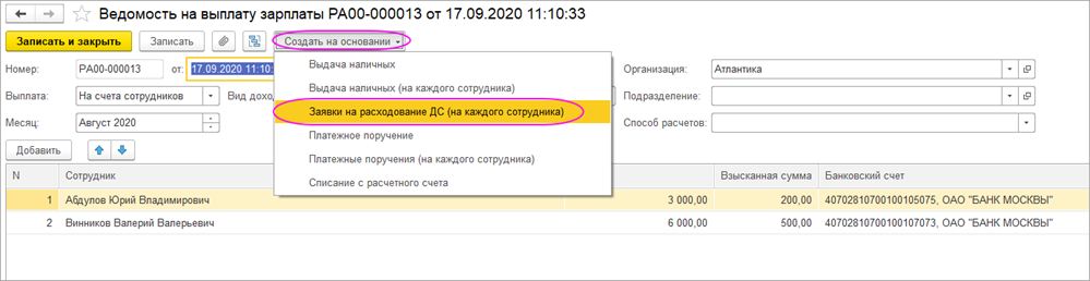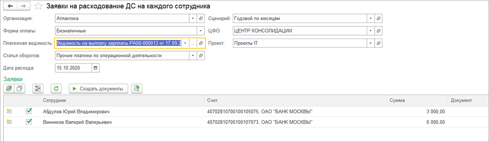 В форме обработки необходимо заполнить Организацию, форму оплаты, платежную ведомость на выплату заработной платы, дату расхода, а так же аналитики, необходимые для создания Заявок на расходование ДС. Флажками отмечаются сотрудники, для которых необходимо создать Заявки. После этого нужно нажать кнопку Создать документы.
