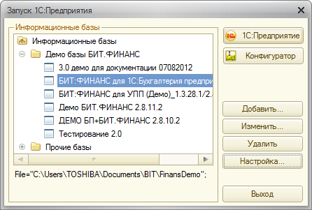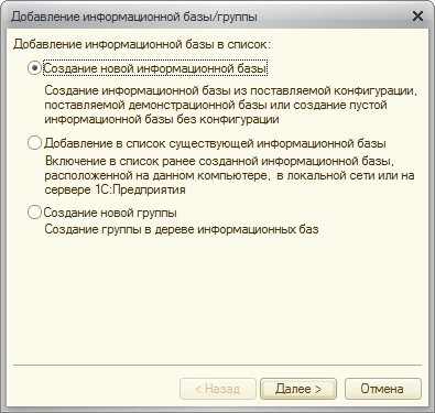 В окне запуска 1С Предприятия для добавления в список новой информационной базы следует нажать кнопку «Добавить».