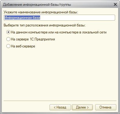 После нажатия на кнопку «Далее >» на экран выводится диалог ввода наименования и выбора типа расположения информационной базы.