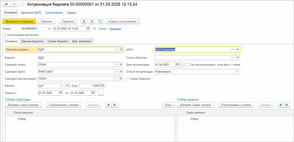 В поле «Отбор данных» можно задать произвольные условия отбора данных. Например, можно актуализировать бюджет по определенной статье оборотов или по определенному ЦФО.