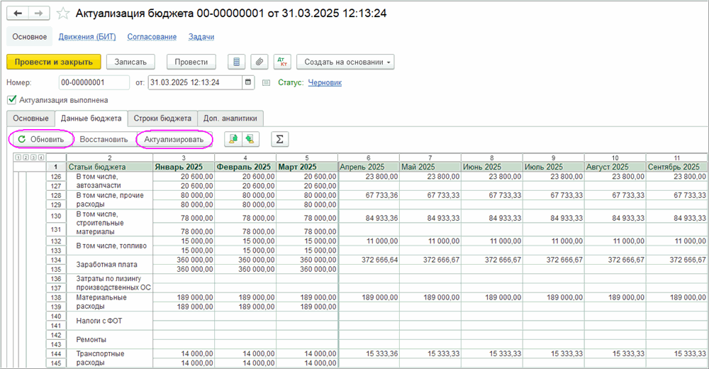 Важно: Если в системе установлен контроль по бюджету, то после проведения документа "Актуализация бюджета" необходимо перепровести документ "Установка контрольных значений". В ином случае лимиты не будут актуализированы. Перепровести "Установку контрольных значений" можно либо вручную, либо настроив регламентное задание. Подробную информацию про настройку регламентного задания можно найти здесь.