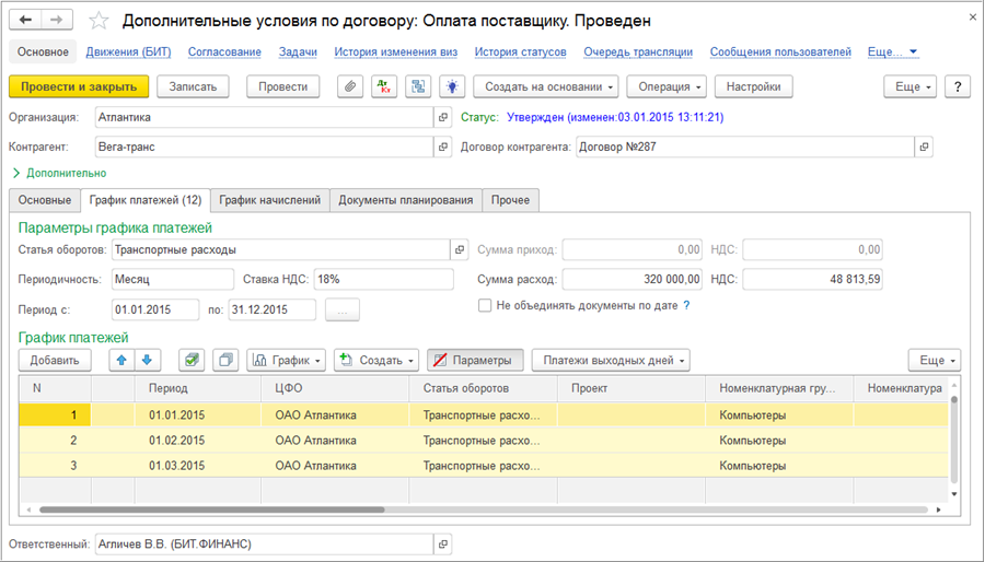 Если на одну и ту же дату в графике платежей присутствует несколько строк с разной аналитикой, то на их основании будет создан один документ планирования или документ прогнозирования, в котором сумма платежа будет представлена в виде списка.