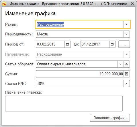 · Изменить суммы платежей в одном или в нескольких периодах. Если строки графика внесены в табличную часть вручную, и нужно распределить сумму расхода (прихода) равными долями между всеми строками, то, после указания общей суммы, необходимо нажать на кнопку «График – Распределить пропорционально».