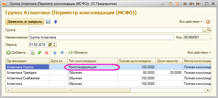Документ «Элиминация» формирует элиминационные проводки по организации, для которой указан тип консолидации «Консолидирующая» в справочнике «Периметры консолидации».