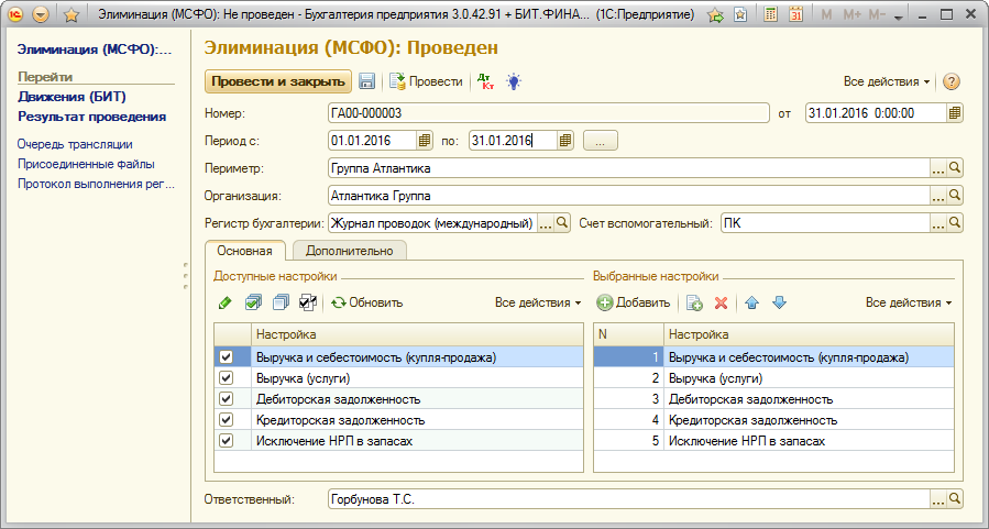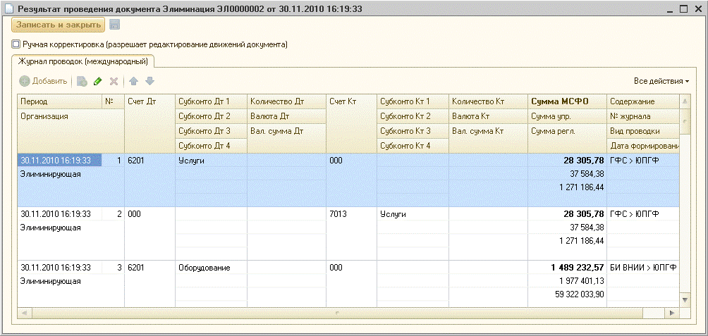 При проведении документа источники данных, указанные в элементах справочника «Настройки элиминации», возвращают данные по внутригрупповым оборотам, по которым документ формирует элиминационные проводки: