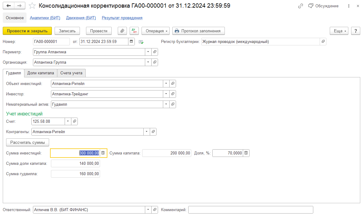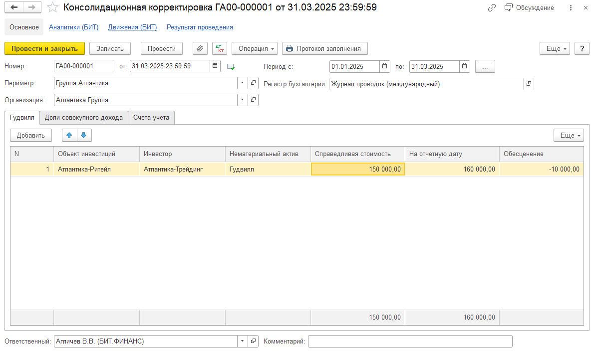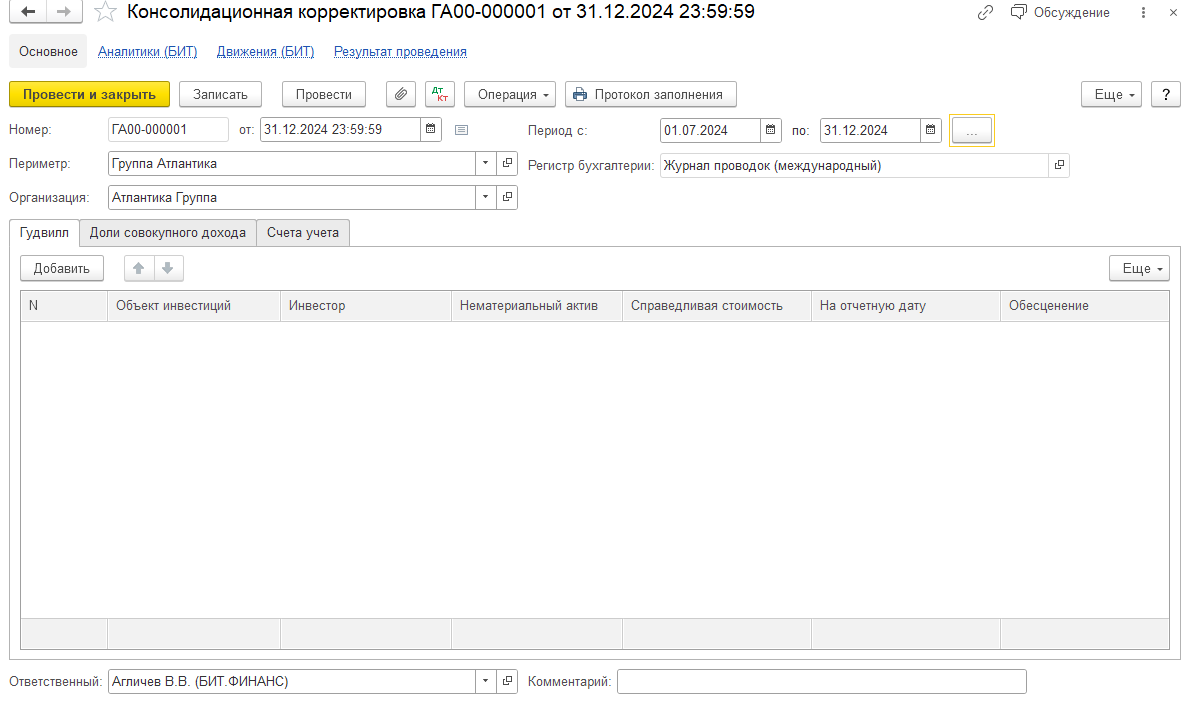 На закладке «Гудвилл» рассчитывается стоимость Гудвилла для консолидированной отчетности по объекту инвестиций, указанному в реквизите «Объект инвестиций».