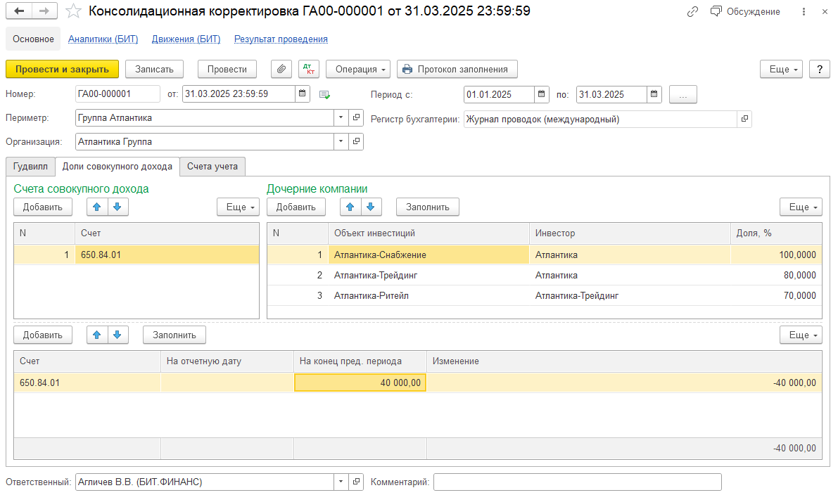 Документ «Консолидационные корректировки» предназначен для отражения консолидационных корректировок, необходимых для получения консолидированной отчетности: