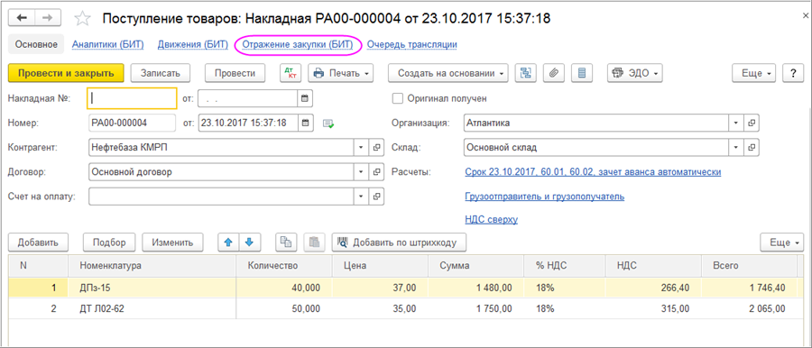 Документ при проведении отражает факт закупки номенклатуры по «Заявке на закупку» и «Заявке на потребность», а также по настройке «Формировать движения по факту бюджета закупок» (в регистре «Настройки БИТ») может отражать факт по Бюджету закупок или по Бюджету доходов и расходов.