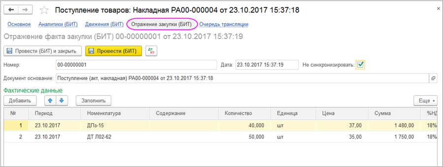 Флаг «Не синхронизировать» устанавливается автоматически при создании документа на основании Заявки на закупку. Это означает, что при изменении данных в документе «Поступление (акты, накладные)» данные в документе «Отражение факта закупки» автоматически не изменятся.