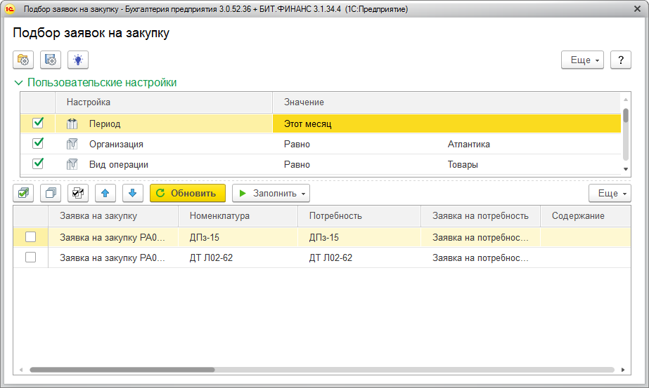 По команде «Заполнить» может осуществляться подбор номенклатурных позиций из нескольких «Заявок на закупку». В форме подбора можно устанавливать отборы по виду операции и любым аналитическим разрезам.
