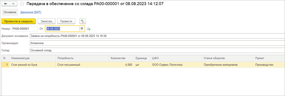 При проведении документа «Передача в обеспечение со склада» документ «Заявка на потребность» переходит в статус «К выдаче».