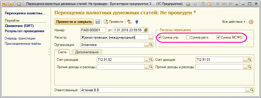 Документ «Переоценка валютных денежных статей (МСФО)» предназначен для отражения переоценки счетов учета, на которых установлен признак «Валютный» по курсу на дату документа.