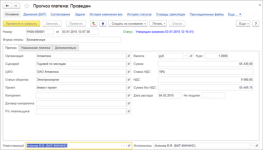 Флаг «Не включать в платежный календарь» - устанавливается для того, чтобы можно было исключить этот прогноз из планируемого расхода денежных средств в отчете «Платежный календарь» и в обработке «Рабочее место казначея» с помощью установки фильтра по таким заявкам;