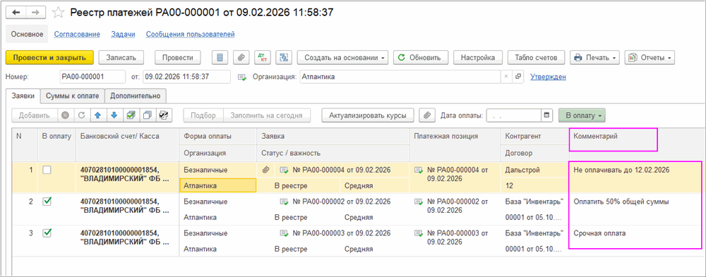 Документ «Реестр платежей» (раздел «Казначейство» - «Реестр платежей») предназначен для формирования платежных документов на основании утвержденных Заявок на расходование денежных средств. Реестр платежей создает казначей или пользователь, ответственный за проведение платежей. Для каждой строки Реестра платежей можно указать комментарий на любом этапе согласования (начиная с версии 3.1.66).