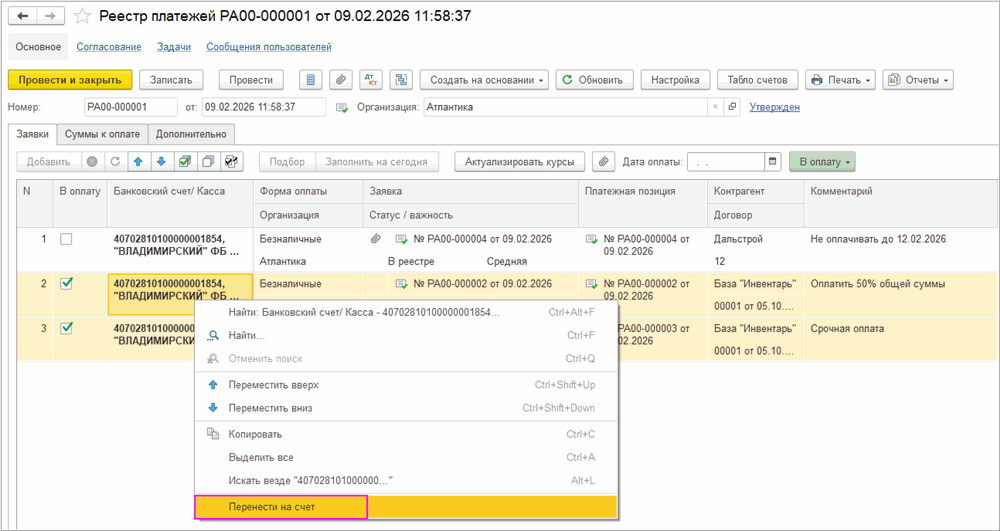В документе «Реестр платежей» начиная с версии 3.1.66 реализована возможность группового изменения банковского счета в строках реестра. Для изменения необходимо выделить заявки на расходование ДС с Shift, нажать правую кнопку мыши - «Перенести на счет» - в открывшемся списке выбрать нужный банковский счет. Таким же способом можно заполнить банковские счета, если они не были указаны при создании заявок.