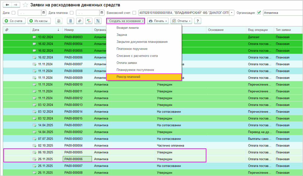 В версии 3.1.66 также добавлена возможность создания «Реестра платежей» на основании выделенных заявок на расходование денежных средств в списке заявок. Для этого необходимо в списке заявок выделить заявки с Shift, и затем нажать «Создать на основании» - «Реестр платежей».