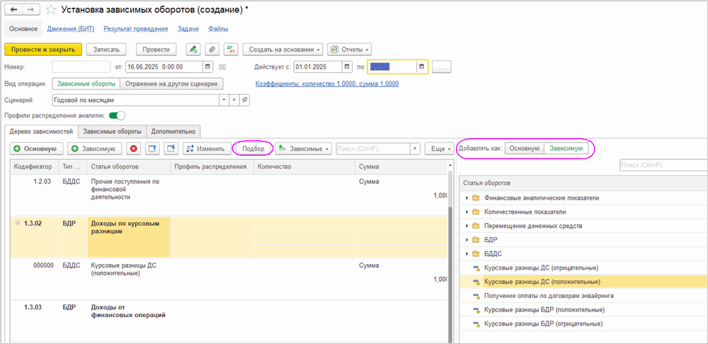 В документе “Установка зависимых оборотов” начиная с релиза 3.1.64 (1С:БП и 1С:БП КОРП) и 3.2.45 (1С:ERP и 1С:КА) предусмотрена возможность подбора основных и зависимых статей оборотов по кнопке “Подбор”. Также реализована возможность после заполнения основных статей автоматически заполнить зависимые статьи по заданным соответствиям в регистре “Соответствия аналитик” по виду соответствия “Статьи БДР - Статья БДДС” или по собственным добавленным видам соответствия, где источником и приемником является статья оборотов (кнопка “Зависимые”).