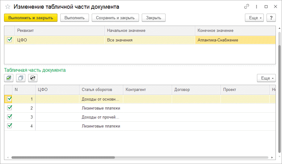 Если необходимо заменить только конкретные значения аналитики, например, только ЦФО «Атлантика» заменить на ЦФО «Атлантика-Снабжение», то необходимо в поле «Начальное значение» выбрать конкретное значение ЦФО «Атлантика» и указать конечное значение «Атлантика-Снабжение». В этом случае в табличной части документа заменятся только значения «Атлантика», остальные значения ЦФО останутся без изменений.