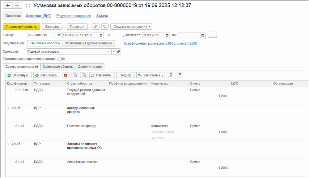 После заполнения всех зависимостей документ следует провести. Сведения об установленных зависимых оборотах будут записаны в регистр сведений «Зависимые обороты».