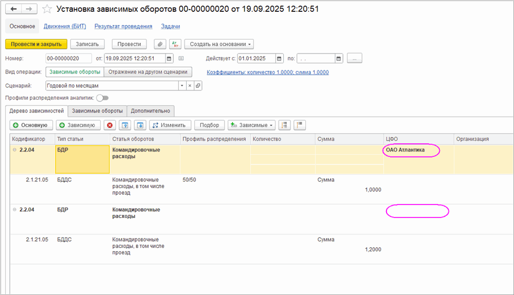 При такой настройке для ЦФО «Атлантика» сработает зависимость с коэффициентом 1 и профилем распределения 50/50, а для любого другого ЦФО – с коэффициентом 1,2.