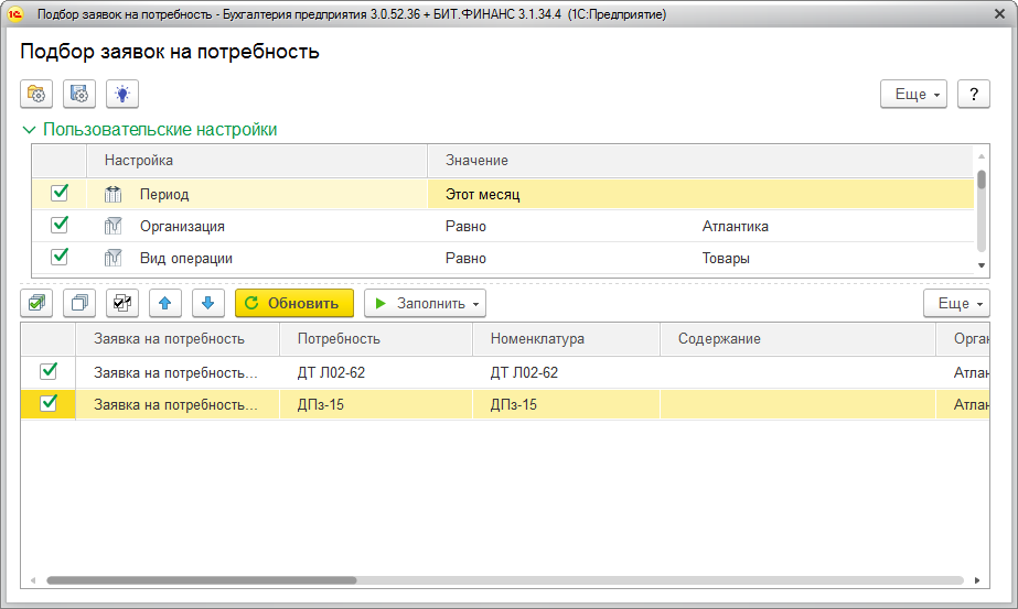 По команде «Заполнить» может осуществляться подбор номенклатурных позиций из нескольких «Заявок на потребность». В форме подбора можно устанавливать отборы по виду операции и любым аналитическим разрезам.