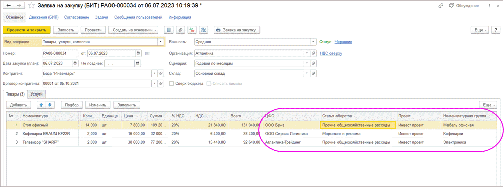 Документ создается на основании документа «Заявка на потребность» сотрудником отдела, отвечающего за материально-техническое обеспечение либо сотрудником отдела закупок в случае, если затребованные материалы, товары, оборудование, услуги необходимо закупить у поставщика. По сути это заказ поставщику на приобретение ТМЦ, услуг или оборудования. Управленческие аналитики заполняются в табличной части документа, что позволяет создать одну Заявку на закупку для нескольких ЦФО, проектов.