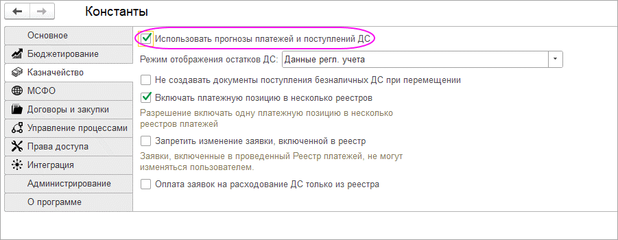 Для краткосрочного прогнозирования движения денежных средств в системе «БИТ.ФИНАНС» предназначены документы «Прогноз платежа» и «Прогноз поступления денежных средств» (раздел «Казначейство»). Для включения функции использования прогнозов необходимо в Константах (БИТ) установить флаг «Использовать прогнозы платежей и поступлений ДС».