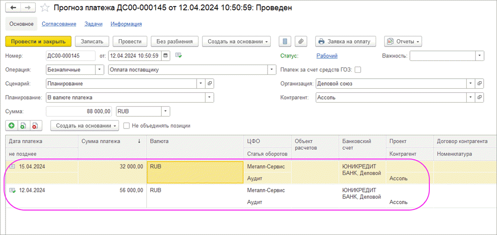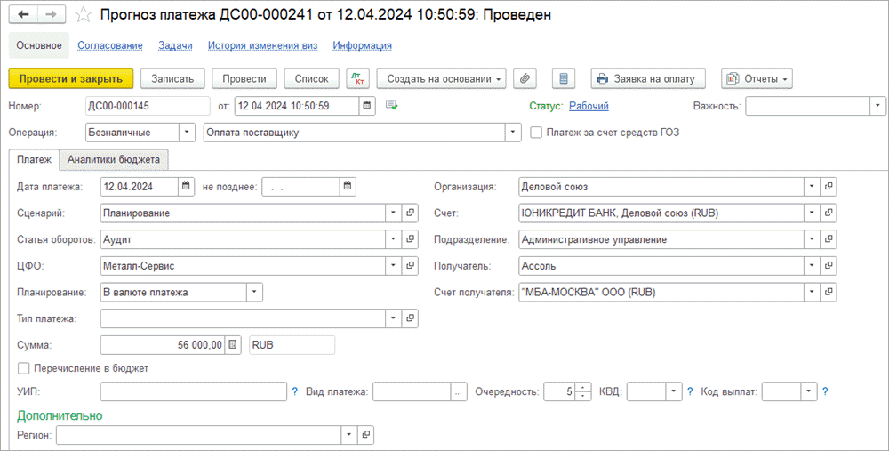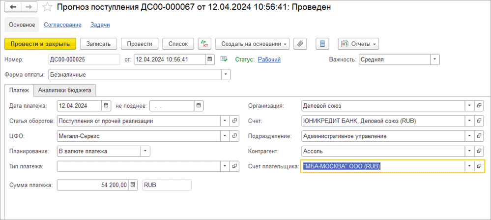 В форме документа «Прогноз платежа» заполняются следующие реквизиты: