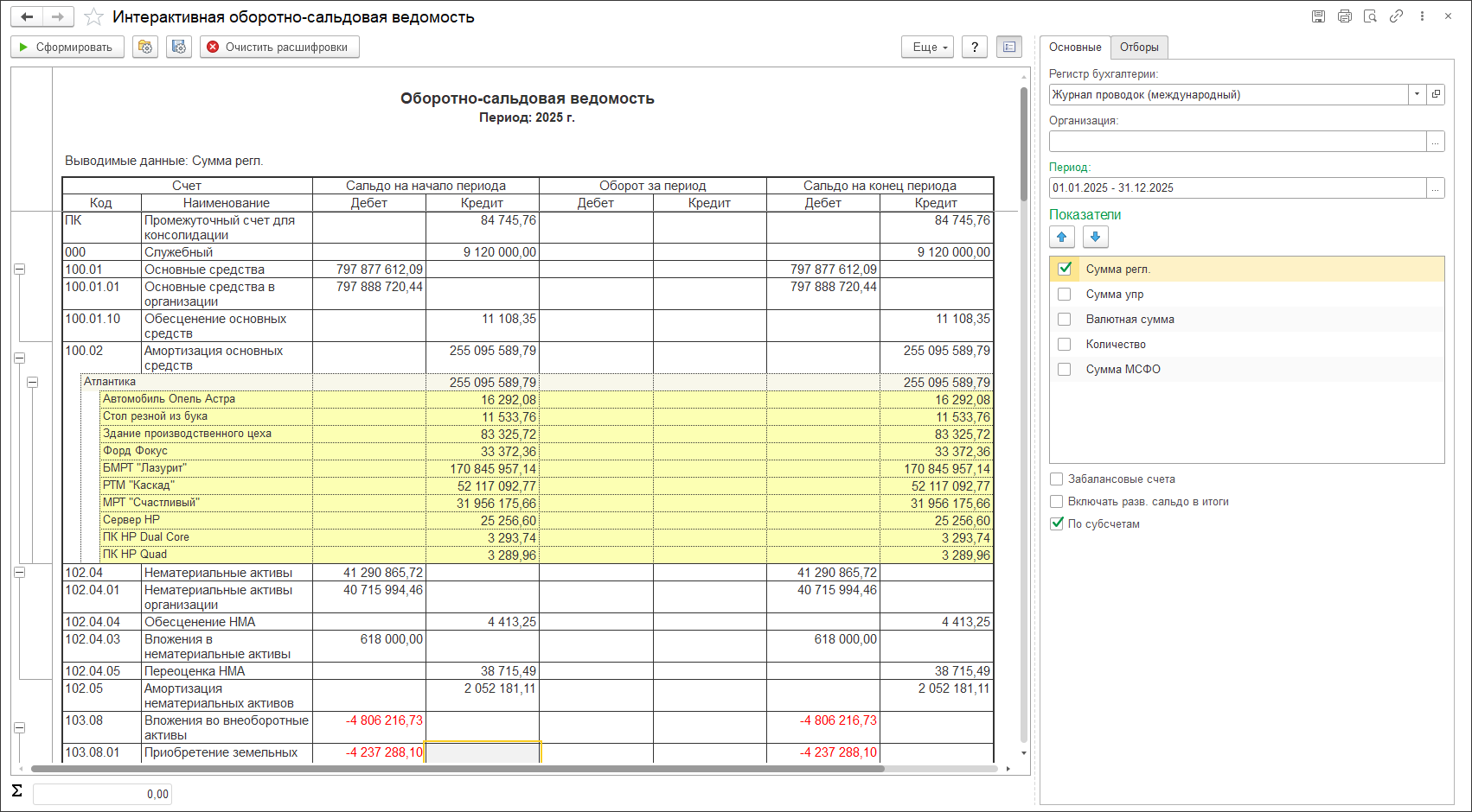 Отчет может быть построен по любому журналу проводок (в том числе по российскому учету и бюджетированию).