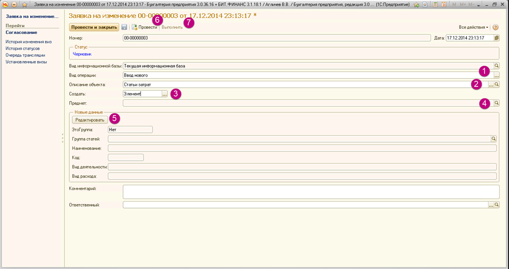 5. Команда «Редактировать». При выполнении этой команды откроется форма элемента справочника для создания нового элемента или изменения существующего, после того как данные будут записаны, они перенесутся на форму Заявки на изменение.