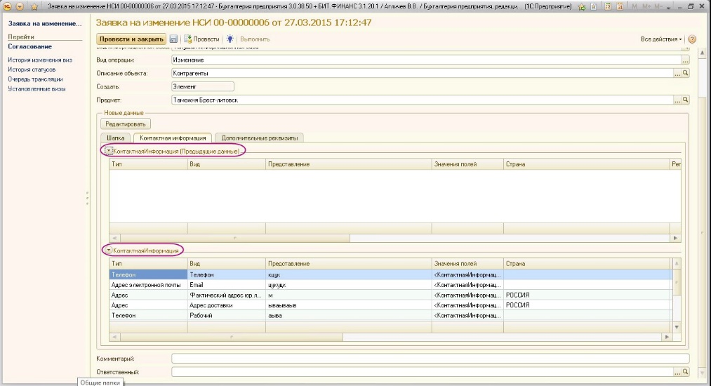 Для документа «Заявка на изменение НСИ» реализовано хранение предыдущих значений реквизитов и табличных частей объекта. Это позволяет согласующим при согласовании Заявки на изменение НСИ ориентироваться, какие реквизиты были изменены и какое у них было значение до изменения.