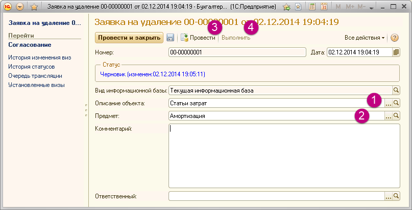 4. Команда «Выполнить» - устанавливает пометку на удаление элемента справочника. Доступна только тогда, когда документ находится в статусе «Утверждена».