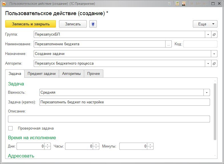 2. В справочнике «Алгоритмы процессов» создадим новый элемент. В точке действия «Распределение бюджета» создадим пользовательское действие: